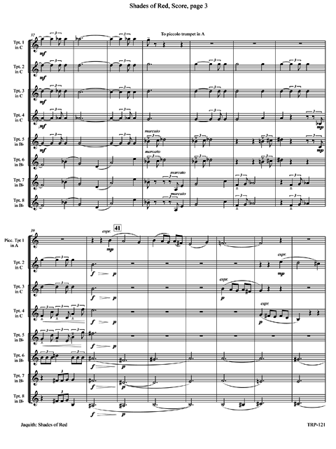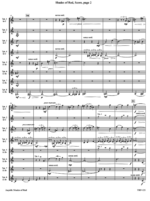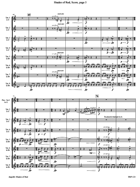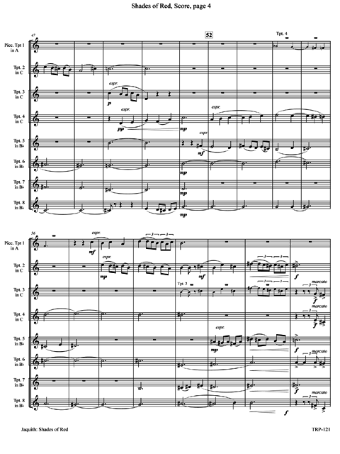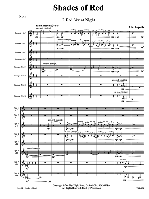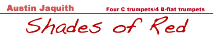 For four C trumpets and four B-flats, with the first C part doubling on piccolo trumpet in A. Very colorful. Lots of interwining and fugal-like interplay. The piece, in two sections, is a poetic interpretation of the nautical wisdom Red sky in the morning, sailors take warning; Red sky at night, sailors delight. A major work interesting to listen to and play. The recording is by members of Cedarville University (Ohio) Trumpet Ensemble and guests under the direction of Charles Pagnard.